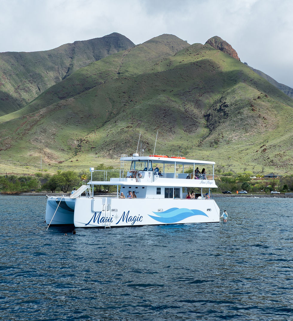 Maui Magic II is a 55' power catamaran designed by Morrelli and Melvin. She is Coast Guard certified for 49 passengers. Her two decks offer ample space with a passthru galley and heads on the lower deck and helm station on the upper deck. Along with the overboard slide off the bow and aft boarding ladders on the stern, large covered seating benches are on the decks. The upper deck sports a casual sun seat. She is powered by twin 425 HP, Catapiller 9.3 engines and electronic controls from Glen Denning. Garmin plotter and custom breaker panels adorn the helm. Maui Magic now operates out of Maalaea Harbor Maui for Maui Magic Charters, slip #55.